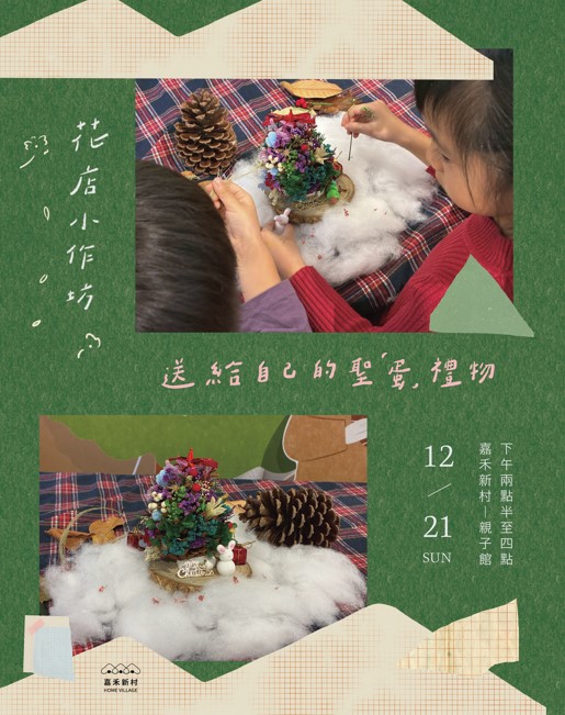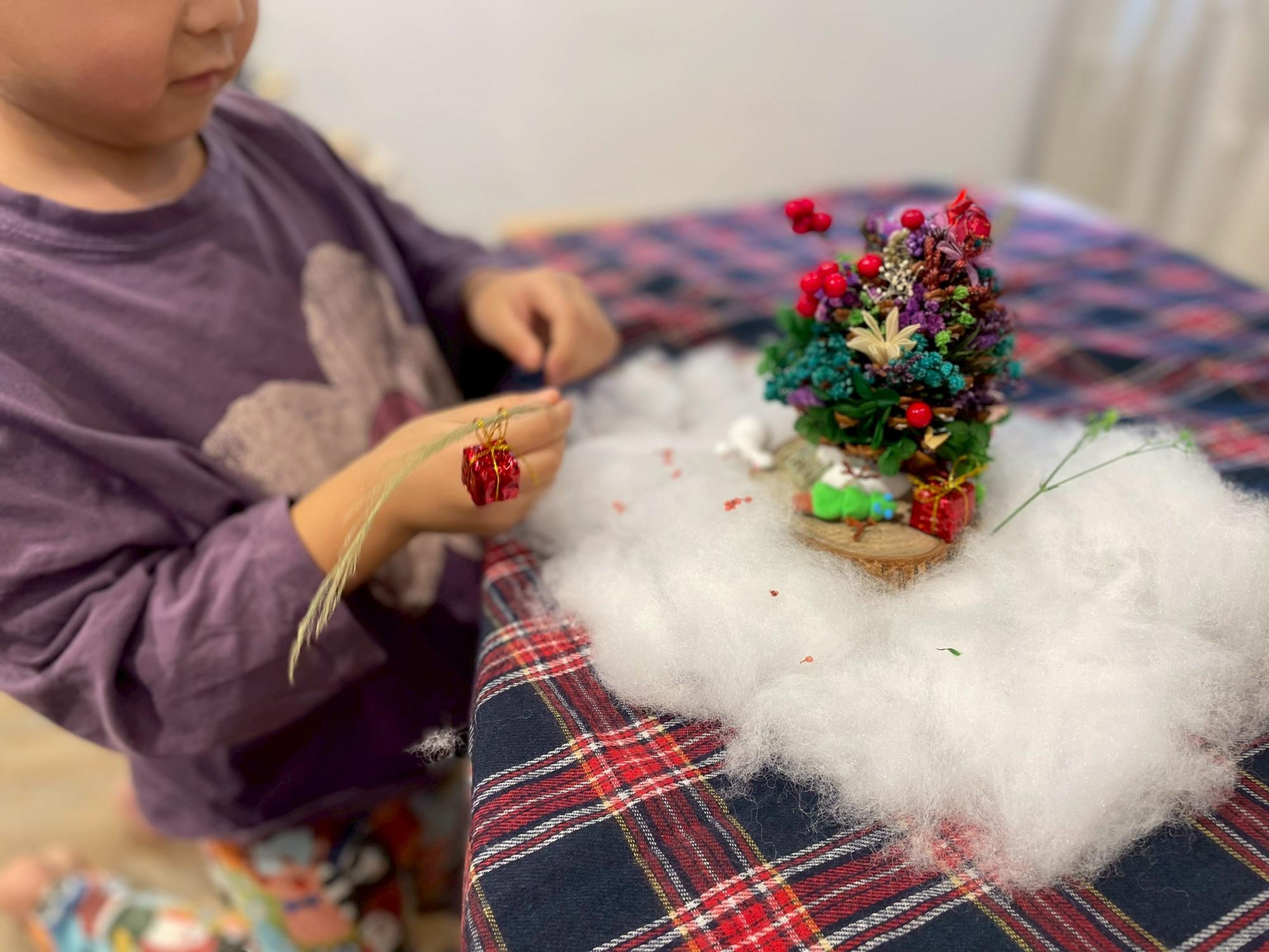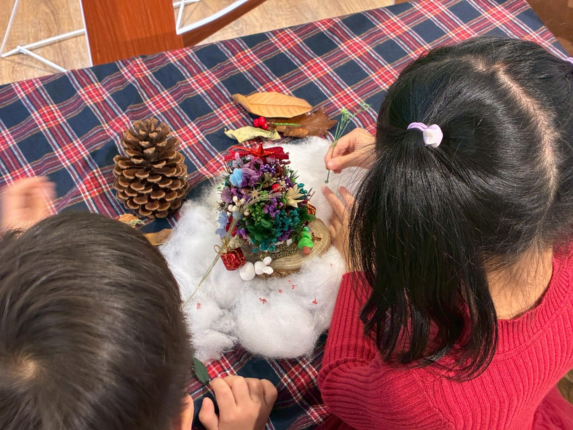 請小朋友挑選三樣最想放上松果聖「蛋」樹的花材、聖誕節裝飾,觀察顏色與材質。