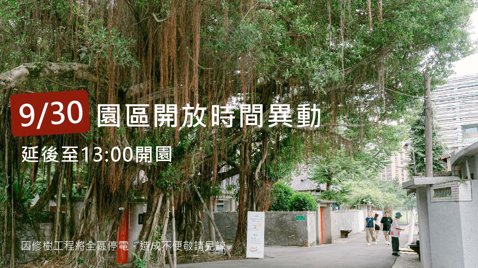 下週二(9/30)上午 9:00 至 12:00,園區將進行修樹工程,期間全區斷電。 當日園區將延後至 13:00 開園,請有計畫來訪的朋友特別留意異動時間,我們下午見 !